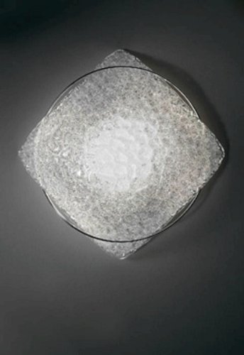 #Vela series wall or ceiling lamp. Choice of size, color, and bulb. The ring and the square, two perfect shapes, are combined in a game of intersections in these light objects, and their value is increased by Murano glass cast into a plate that recalls a SAIL (VELA) blown up by the wind. The peculiar fine grit-like manufacturing of the glass plate gives the light wide diffusion and extraordinary brilliancy. The metal section is either in polished chrome when matched with transparent glass, or in matte gold if matched with amber glass. Small Size Clear crystal Glass 1x100W R7s Bulb Mfg code(s): 1704CR